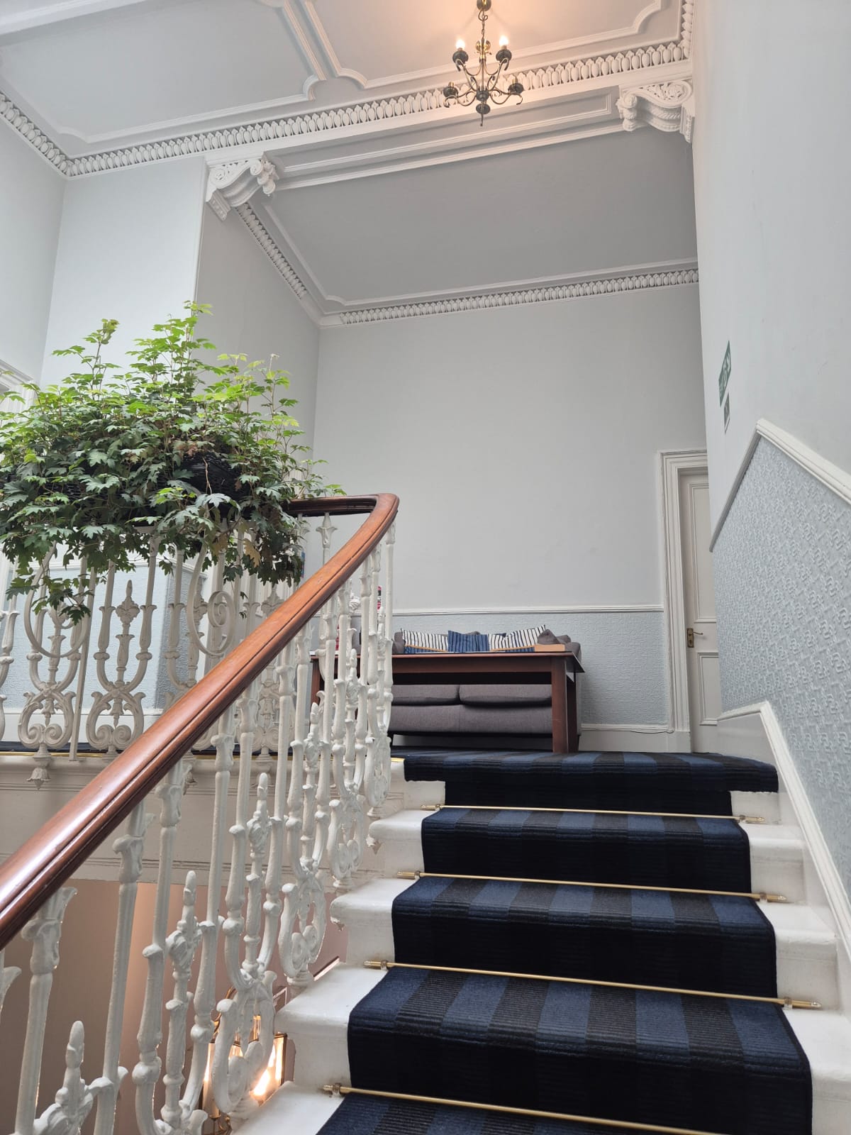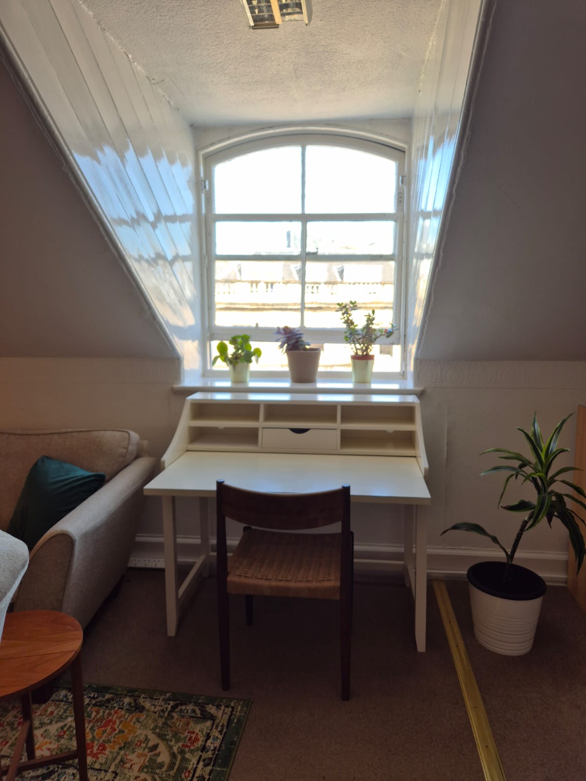 The room has a homely feel with soft lighting and warm colours. It has a desk positioned by the window—ideal for online therapy sessions as well as in-person work. It’s quiet, private, and feels like a wee sanctuary away from the busyness of the city. The room is located in a beautiful Georgian townhouse. It is on the 3rd floor and there is no lift. It provides a calm, professional setting for all kinds of talking therapy.